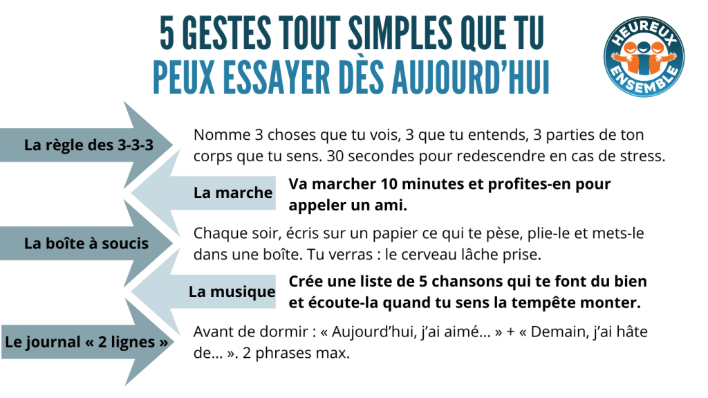 Chez Heureux Ensemble, on a envie de rendre ce geste encore plus facile. C’est pourquoi on vous invite à notre groupe d’entraide en ligne : un mardi soir sur deux à 19 h, un espace pour exprimer ce qu’on traverse afin de ne pas le traverser seul. L’inscription est simple et gratuite.
